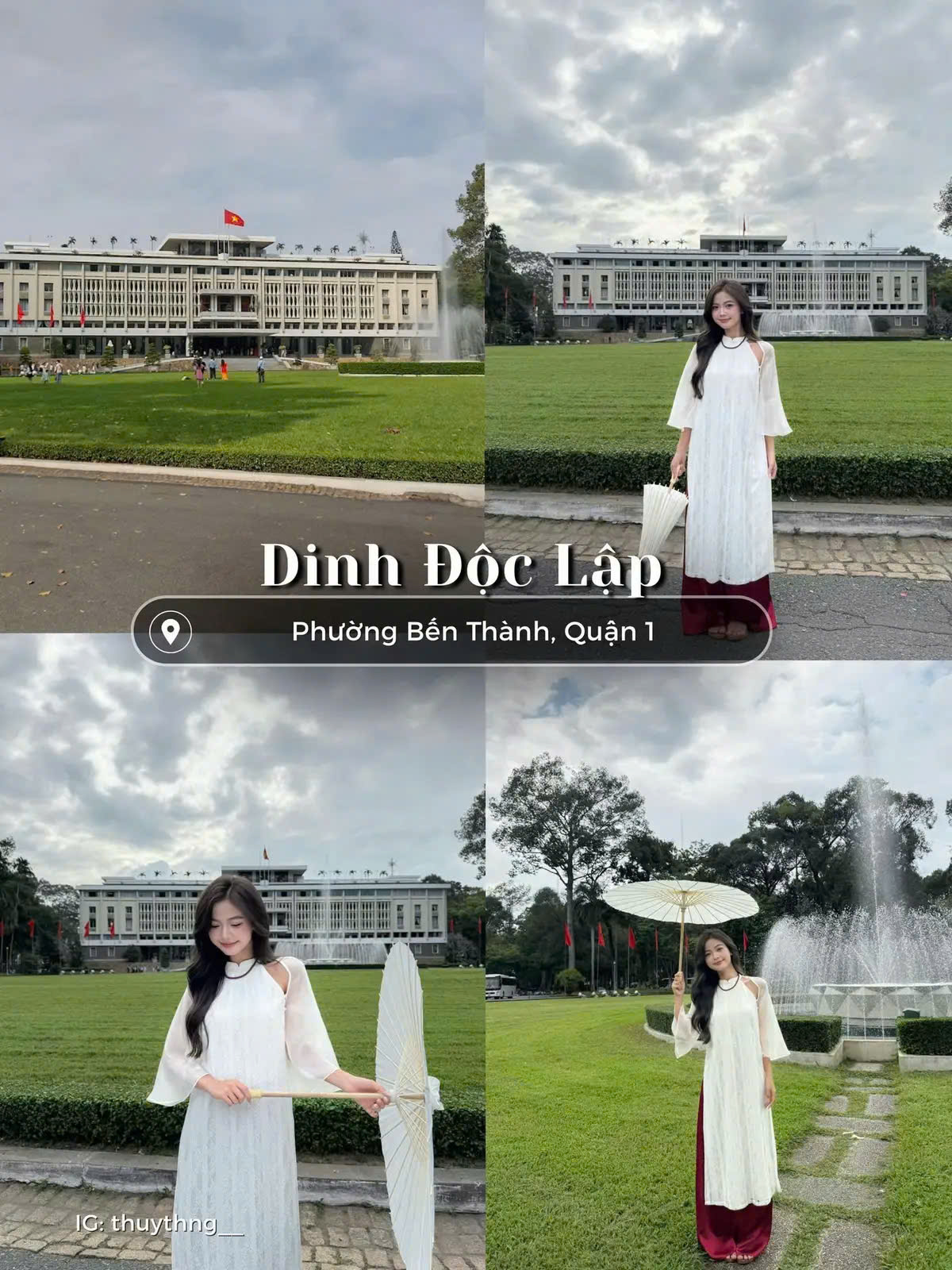 Dinh Độc Lập là biểu tượng lịch sử của TPHCM. Với thảm cỏ rộng, hành lang lớn và kiến trúc trang nghiêm, nơi đây là địa điểm chụp hình áo dài đẹp ở TPHCM phù hợp với concept áo dài truyền thống, áo dài chụp kỷ niệm, tốt nghiệp hoặc ảnh tập thể.
