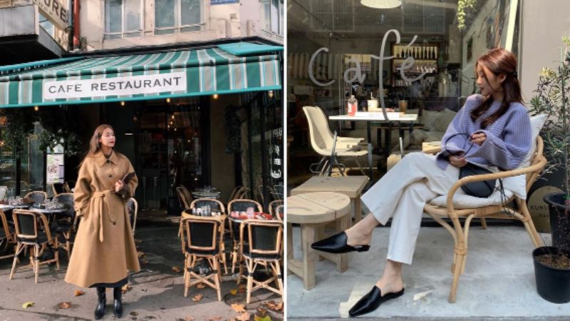 Đứng hoặc ngồi trước cửa quán, nhìn sang hướng khác với tư thế suy tư sẽ tạo bức ảnh tự nhiên, sang chảnh. Lưu ý: khi đứng, nên để camera hướng từ dưới lên để trông cao hơn.