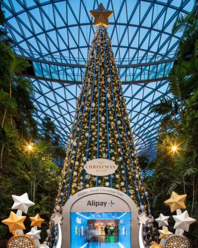 Bước sang Jewel Changi, đừng bỏ lỡ cây thông cao 16 mét đặt giữa không gian Rain Vortex huyền ảo. Mỗi tối, cây thông được kết hợp cùng trình diễn ánh sáng và tuyết rơi nhân tạo, tạo nên khung cảnh Giáng Sinh lung linh, khiến bất kỳ du khách nào cũng muốn dừng chân lâu hơn để thưởng thức và chụp ảnh.