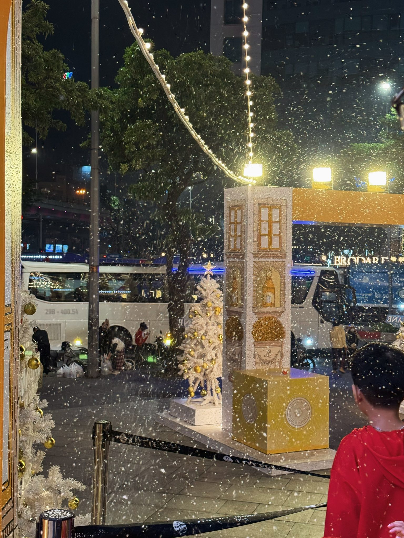 Điểm đặc biệt khiến Lotte Liễu Giai năm nay trở thành “nơi phải đến” chính là hoạt động tuyết rơi miễn phí ngay tại quảng trường trung tâm. Tuyết sẽ rơi từ 19h – 21h mỗi Thứ Bảy và Chủ Nhật, tạo nên khung cảnh lung linh không khác gì trời Âu giữa lòng Hà Nội. Chỉ cần đứng dưới màn tuyết nhẹ nhàng rơi xuống, bạn sẽ có ngay những bức ảnh đậm vibe Giáng Sinh mà không cần đi du lịch xa.