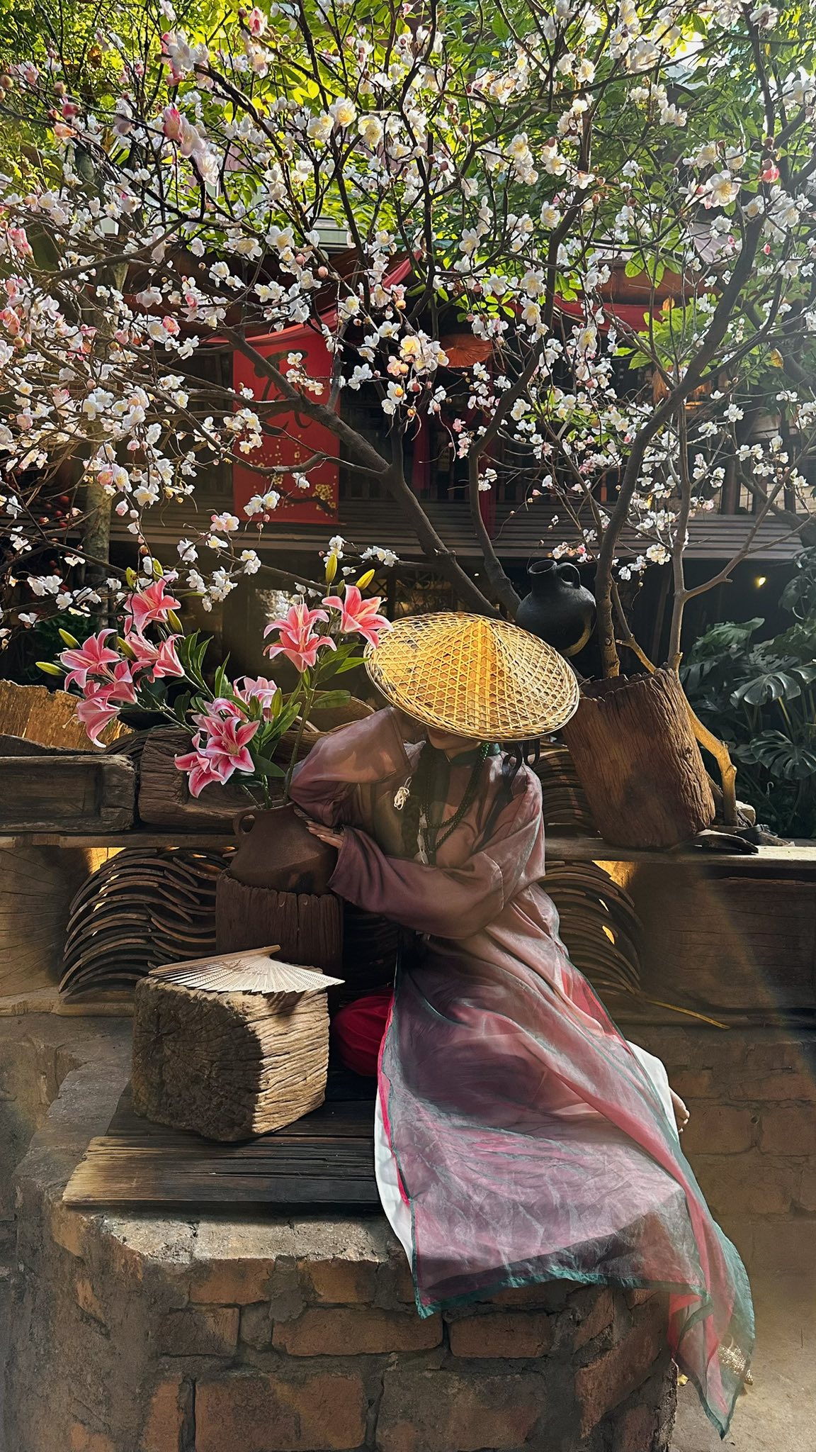 - Khu vực ngoài trời thoáng, dễ tạo dáng với outfit áo dài, váy Tết