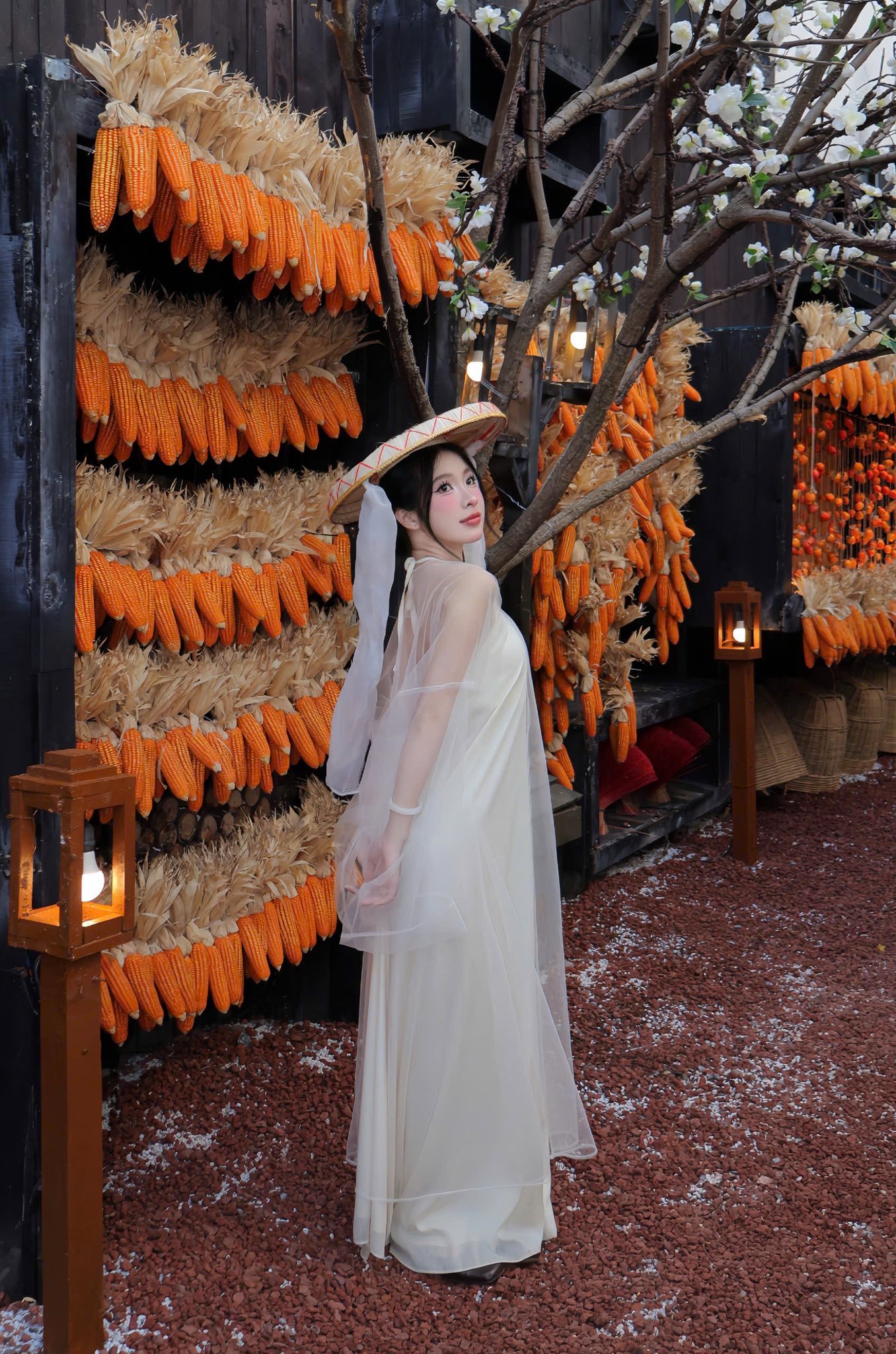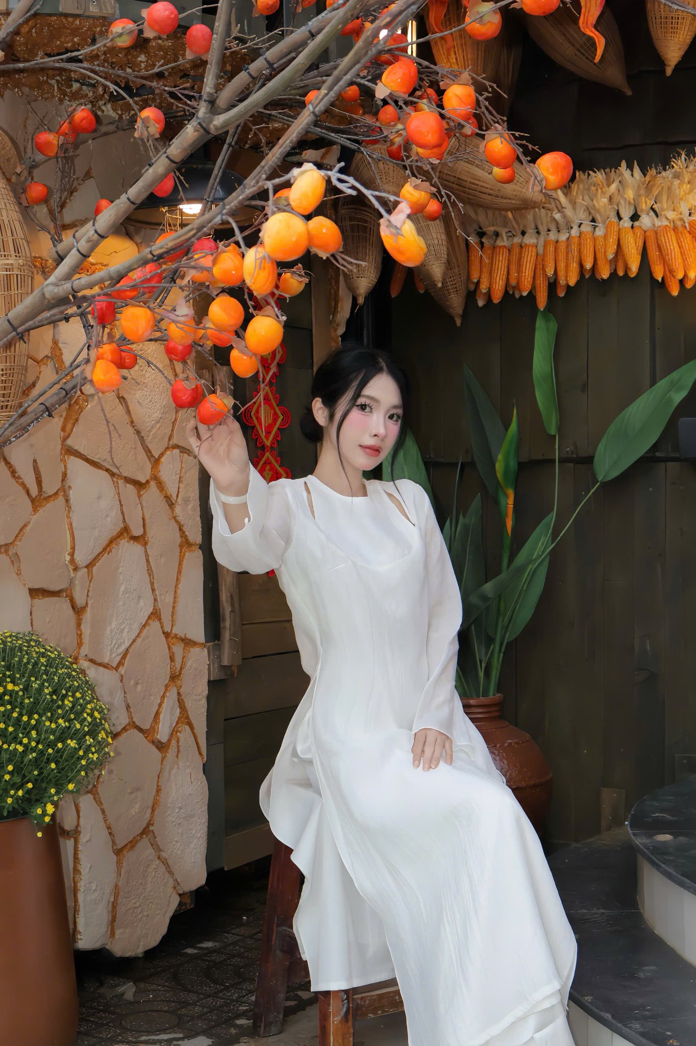 Concept Tết 2026 tại Hỉn Coffee đặc biệt phù hợp với các loại trang phục truyền thống hoặc mang hơi hướng vintage. Áo dài truyền thống, áo dài cách tân, trang phục vải linen, váy đơn sắc hoặc trang phục mang tông màu trung tính đều rất dễ hòa hợp với background của quán.