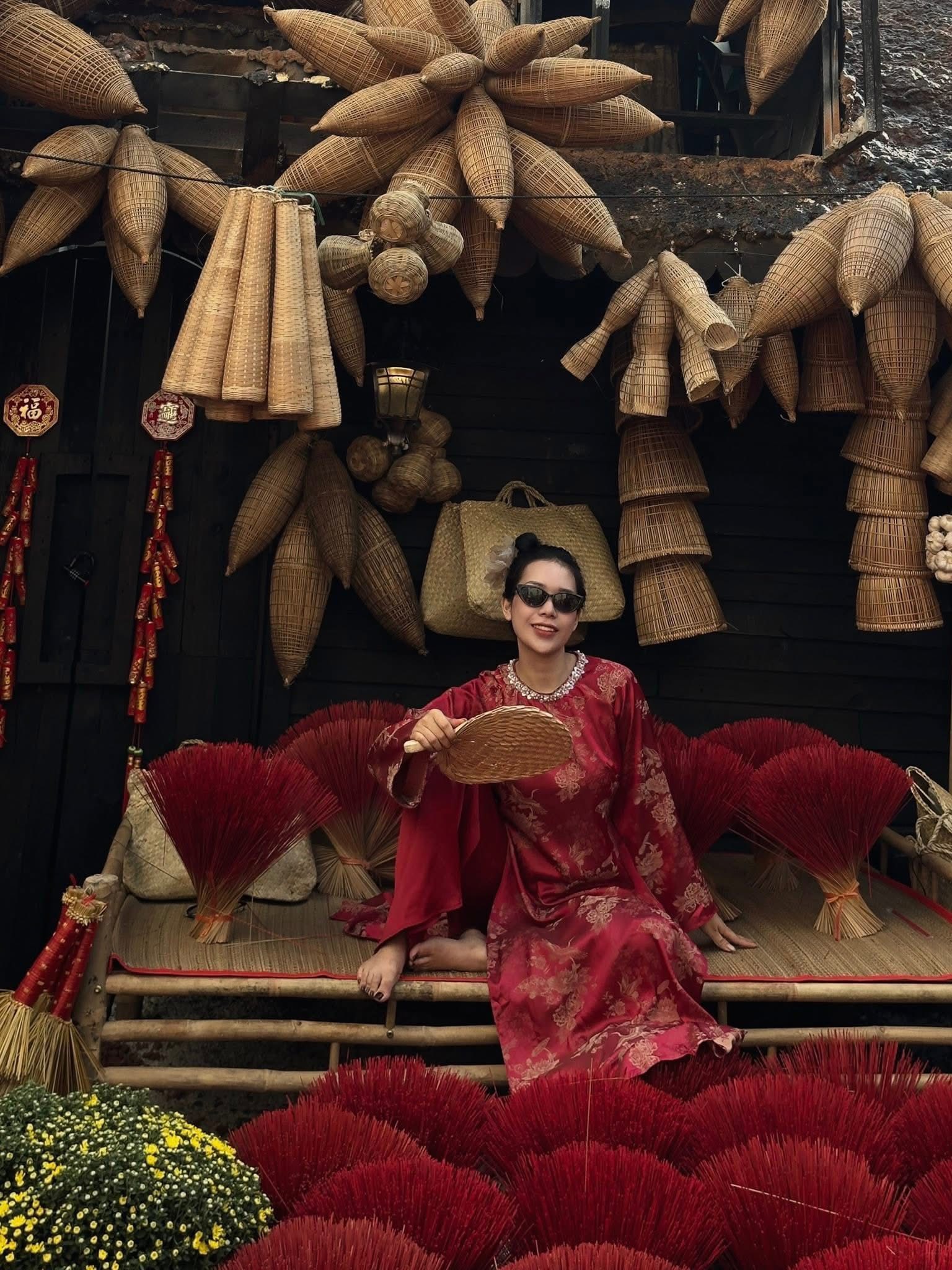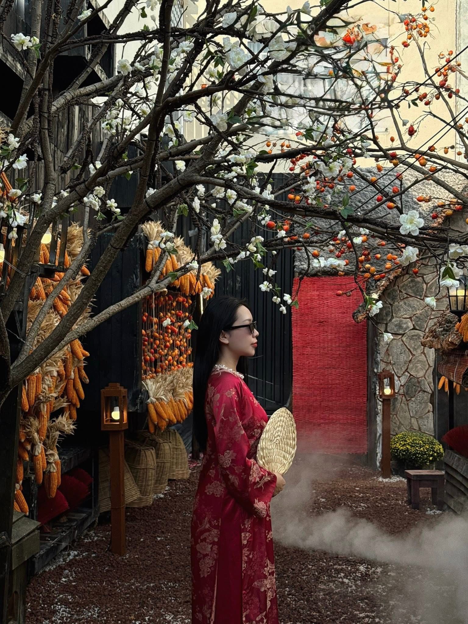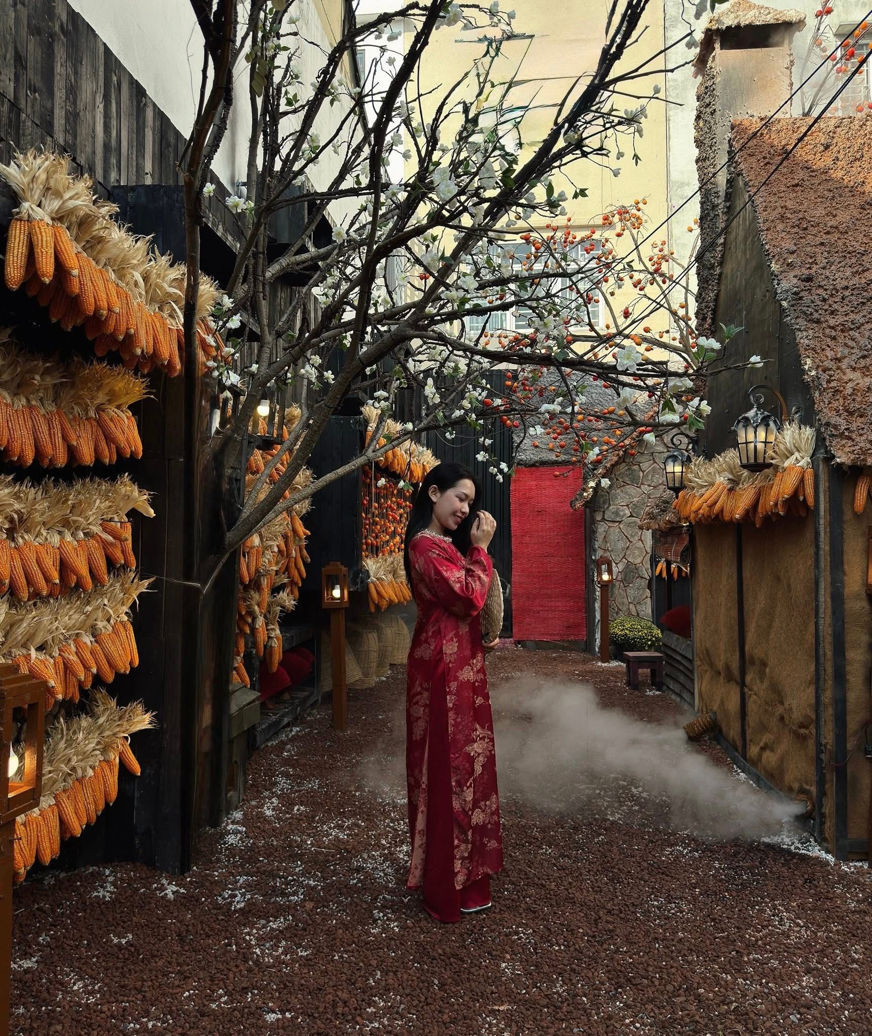 Những tiểu cảnh như cổng tre, khung cửa gỗ, họa tiết thổ cẩm được sắp đặt xen kẽ với hoa mai, hoa đào và các vật dụng trang trí Tết quen thuộc. Sự kết hợp này giúp không gian mang hơi thở Tết xưa nhưng vẫn rất phù hợp với nhu cầu chụp ảnh hiện đại.