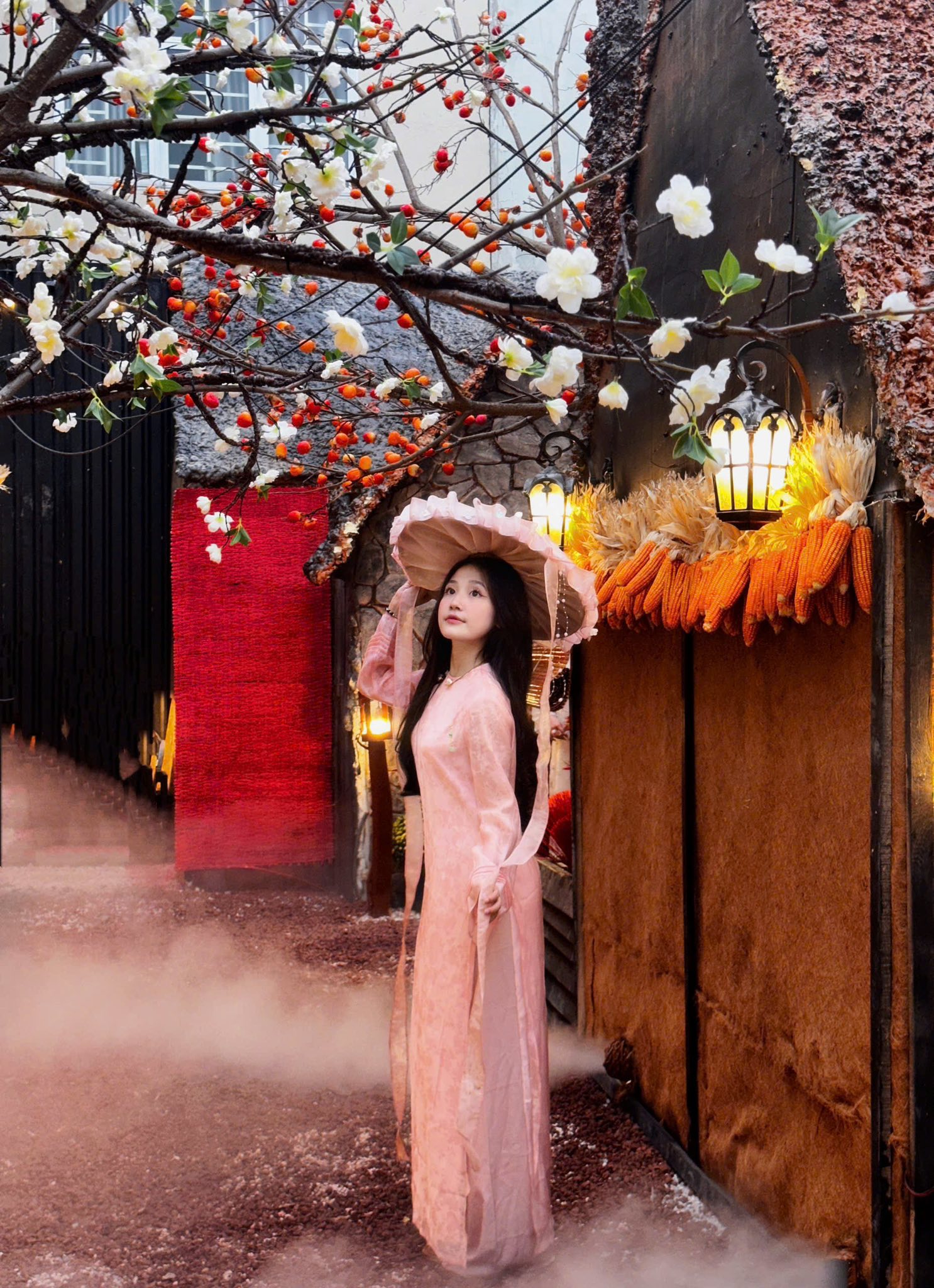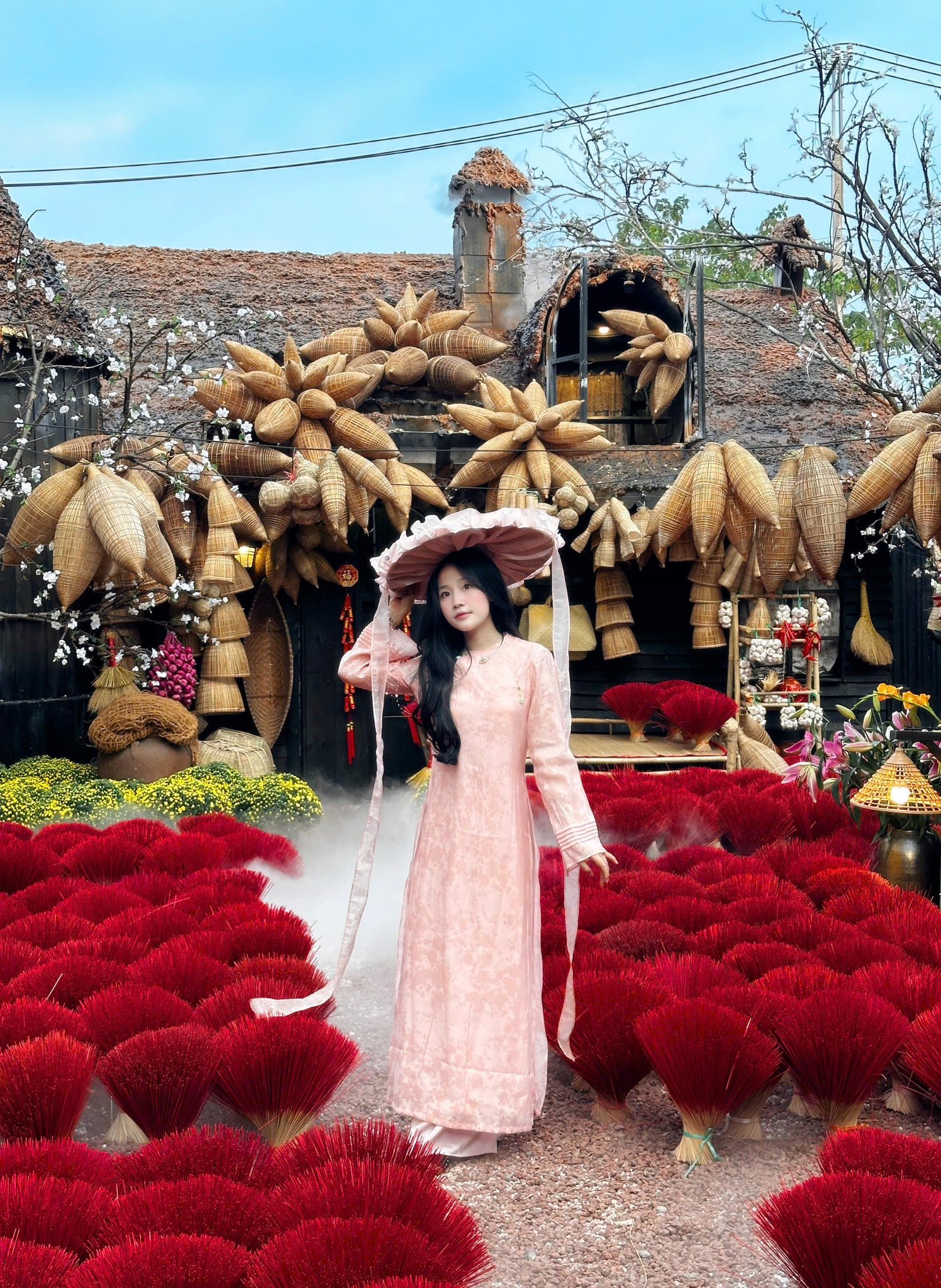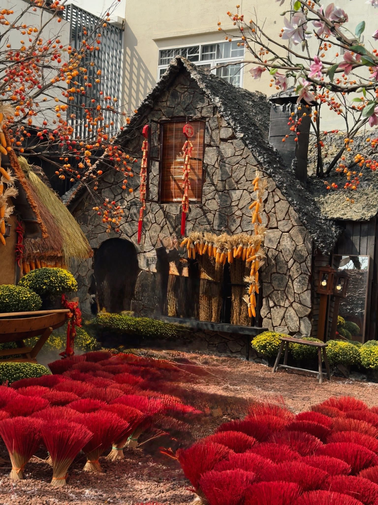 Những tiểu cảnh như cổng tre, khung cửa gỗ, họa tiết thổ cẩm được sắp đặt xen kẽ với hoa mai, hoa đào và các vật dụng trang trí Tết quen thuộc. Sự kết hợp này giúp không gian mang hơi thở Tết xưa nhưng vẫn rất phù hợp với nhu cầu chụp ảnh hiện đại.
