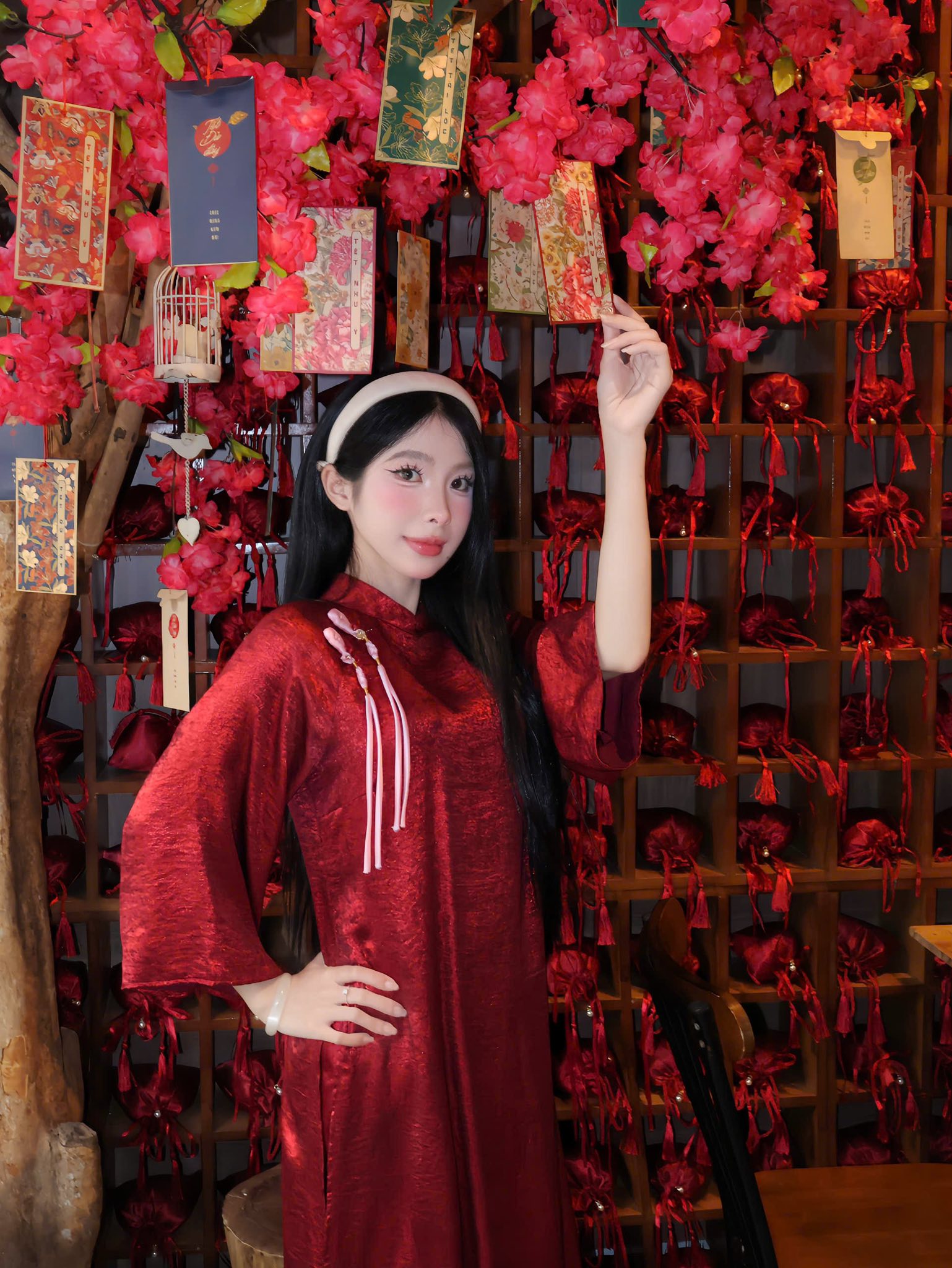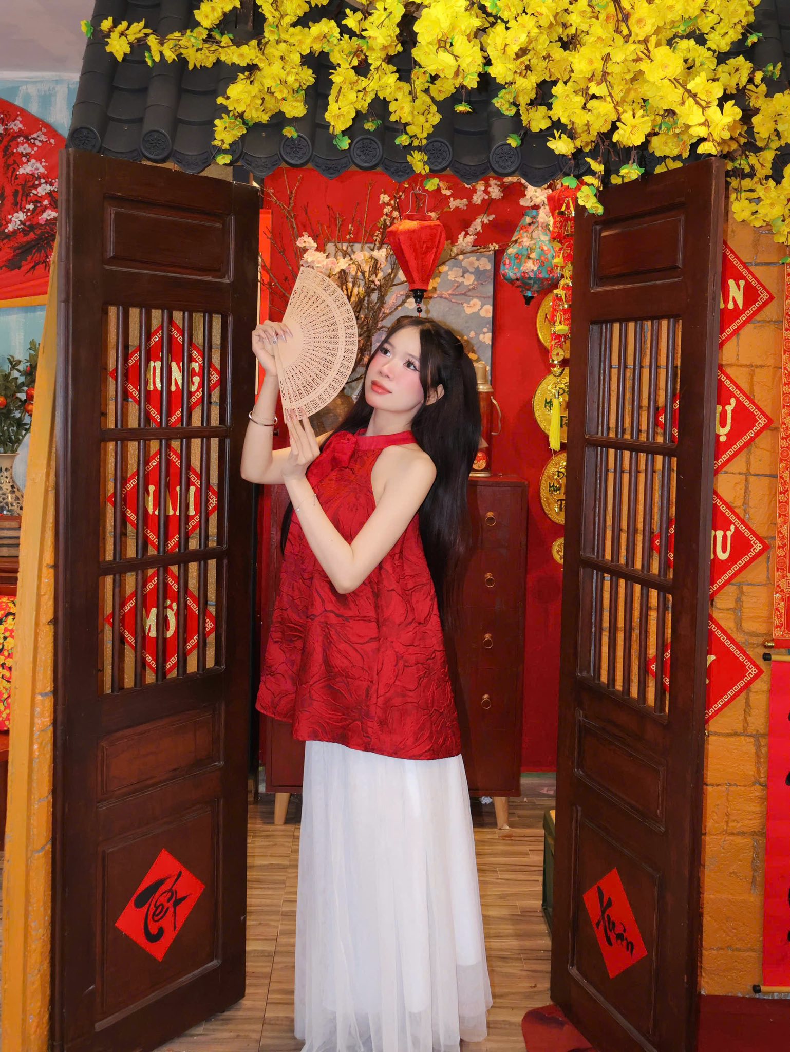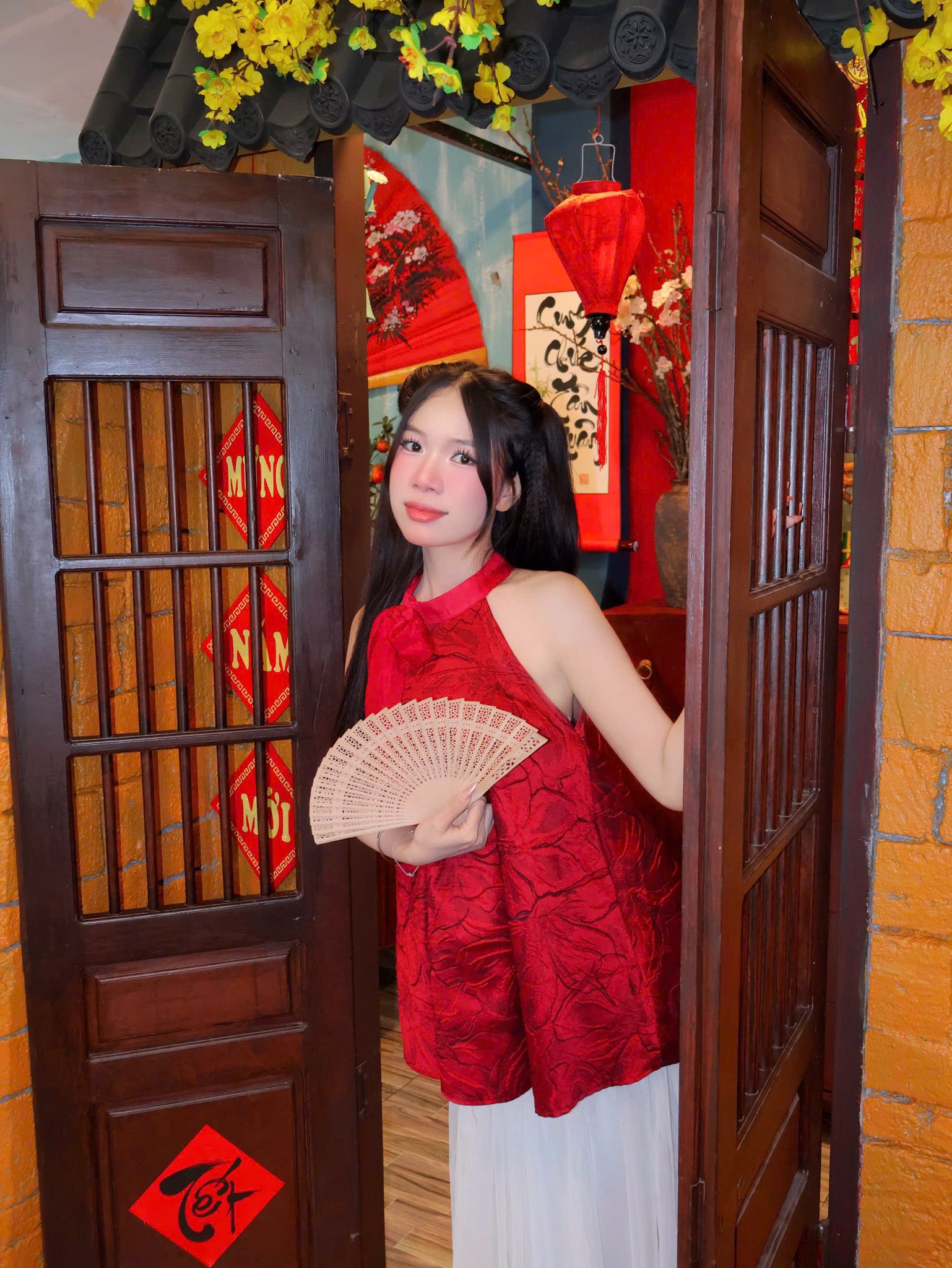 Những dải lụa đỏ mềm mại, đèn lồng lung linh, câu đối xuân cùng cành mai, cành đào được bố trí hài hòa, tạo nên một bức tranh mùa Xuân ấm áp và gần gũi. Mỗi góc nhỏ trong quán đều trở thành phông nền hoàn hảo cho những bức ảnh kỷ niệm Tết sớm, mang đậm tinh thần truyền thống nhưng vẫn rất hiện đại.