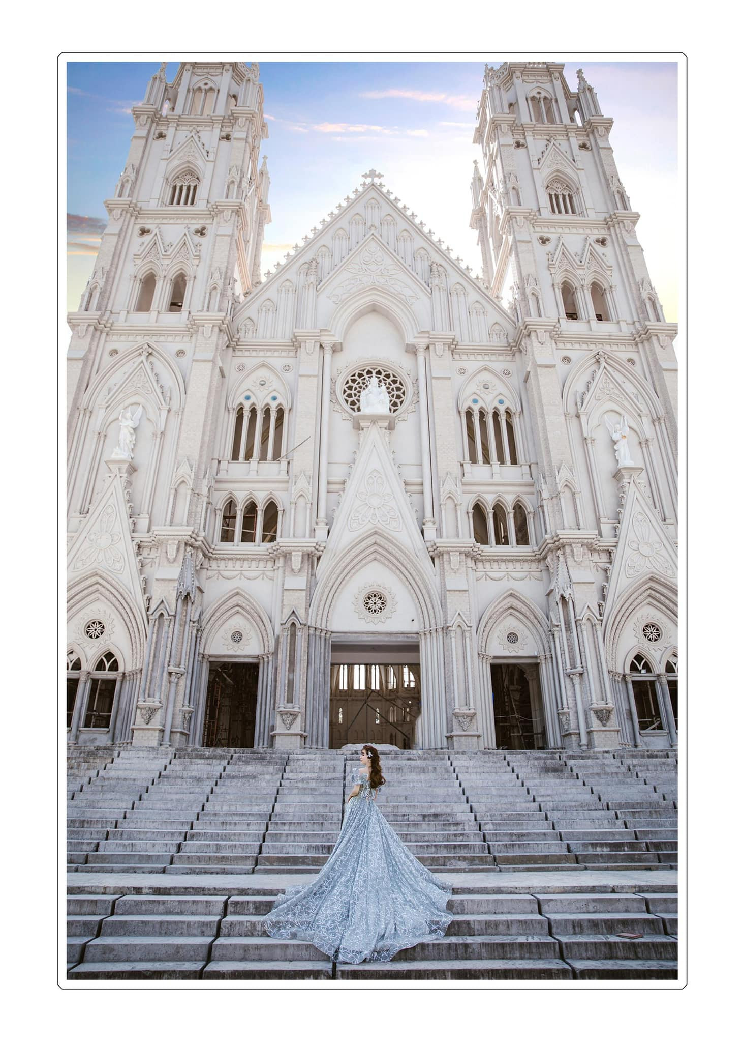 Những set đồ mang hơi hướng mùa đông châu Âu sẽ giúp bộ ảnh hài hòa hơn với không gian nhà thờ.