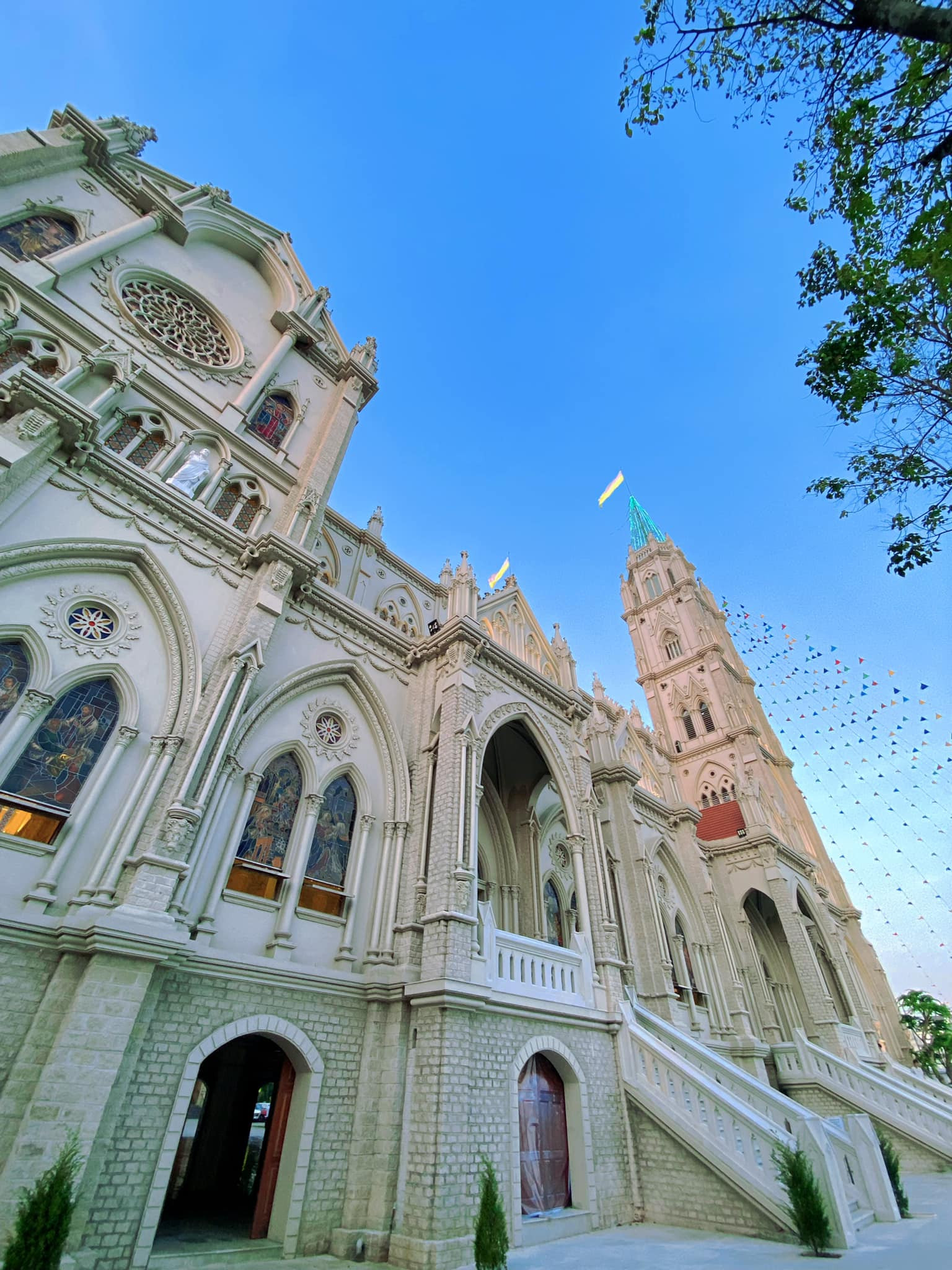 Dù chụp ảnh từ xa, cận cảnh hay toàn cảnh, nhà thờ vẫn giữ được vẻ sang trọng, cổ kính. Đặc biệt, khi lên đèn vào buổi tối, ánh sáng vàng kết hợp với màu tường sáng tạo nên cảm giác như đang đứng trước một công trình châu Âu thực thụ.