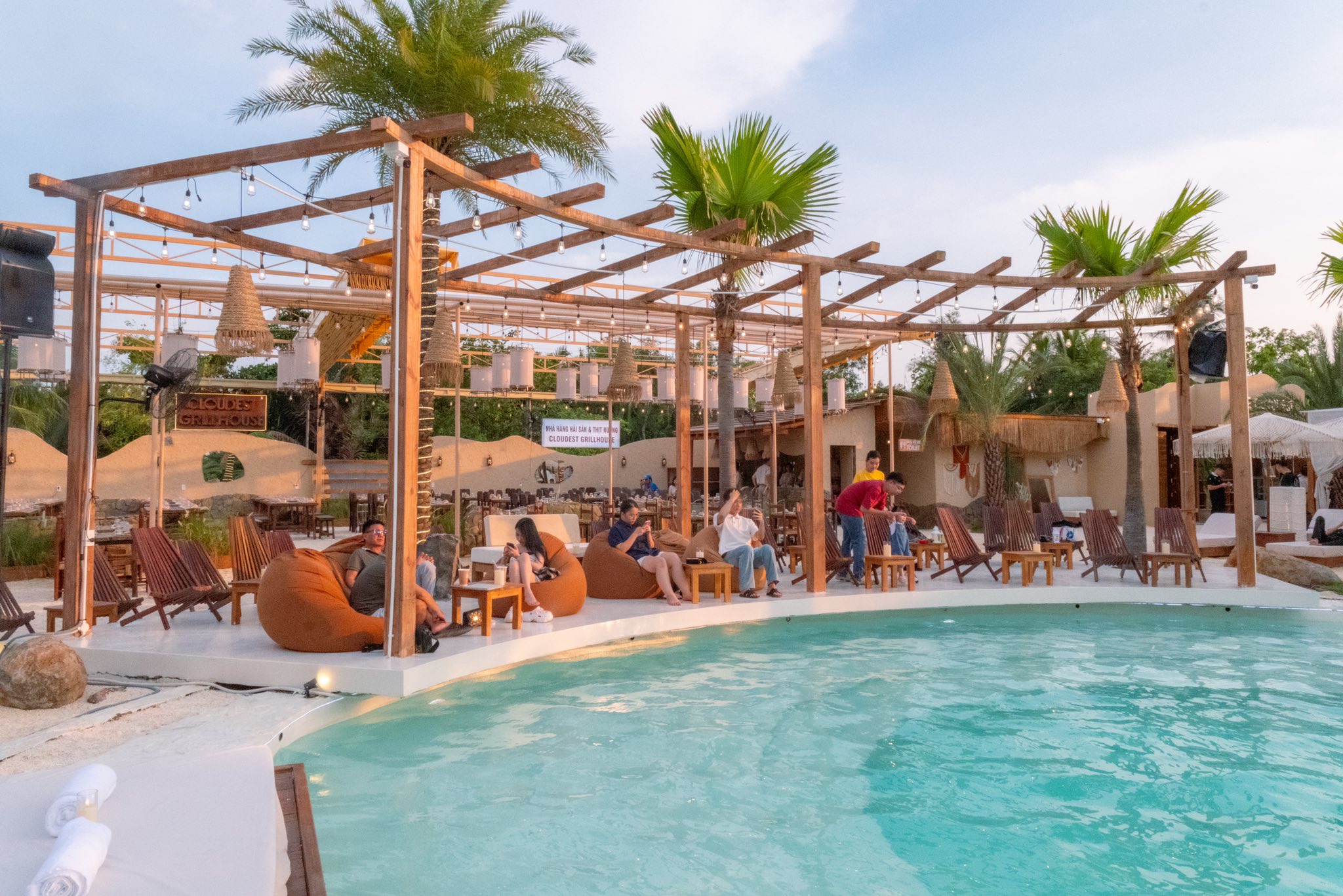 - Khu cà phê ban ngày: bàn gỗ, rèm vải, sát hồ bơi