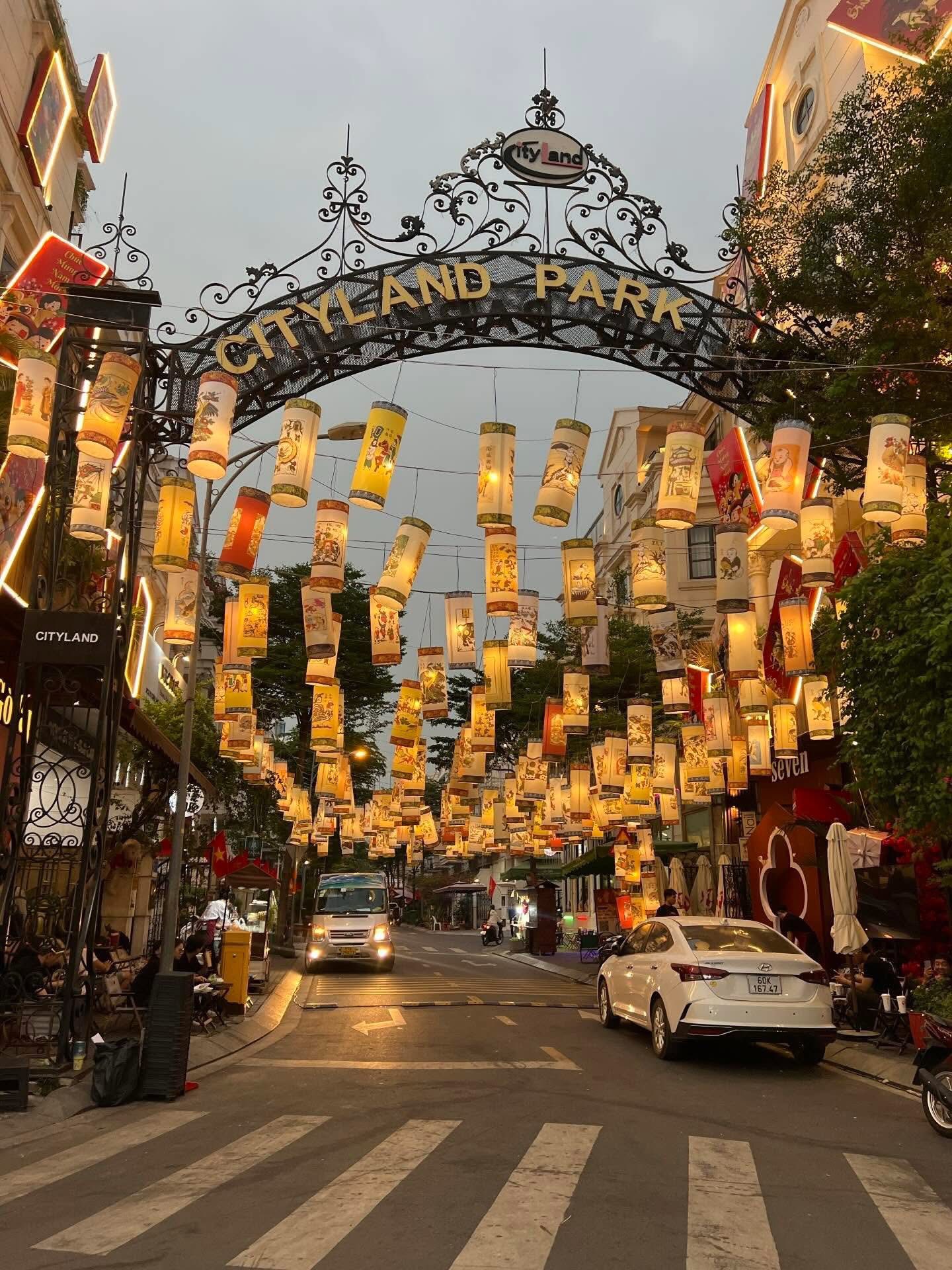 - Hàng trăm đèn lồng treo cao, tỏa ánh sáng vàng ấm vào buổi chiều tối
