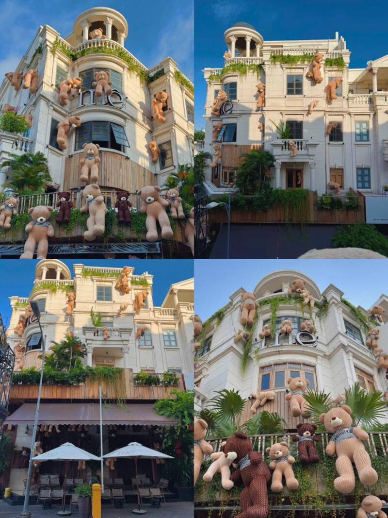 Từ khu vực trong nhà đến ngoài trời, gấu bông xuất hiện ở cầu thang, ban công, góc ngồi và các background chụp ảnh. Sự kết hợp giữa gấu bông dễ thương và không gian Tết rực rỡ tạo nên một cảm giác rất riêng – vừa ấm áp, vừa vui tươi, phù hợp cho cả nhóm bạn lẫn gia đình có trẻ nhỏ.