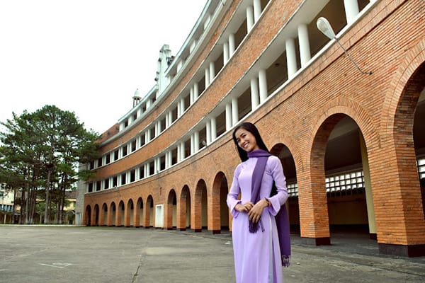 Trường Cao đẳng Sư phạm Đà Lạt nổi bật với kiến trúc vòng cung và hàng gạch đỏ cổ kính. Đây là địa điểm chụp ảnh áo dài quen thuộc của nhiều thế hệ học sinh, sinh viên và du khách.