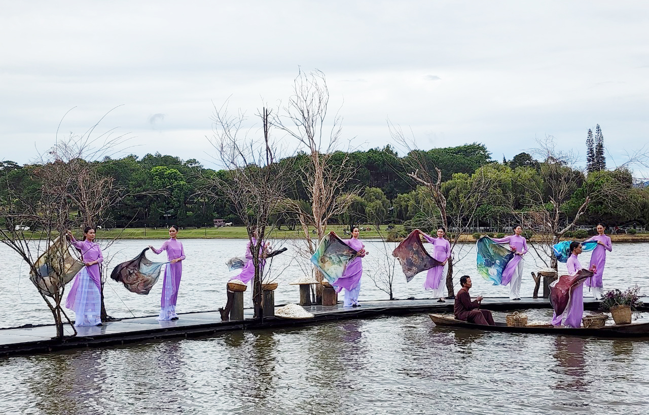 Áo dài bay nhẹ trong gió kết hợp với mặt hồ và sương sớm tạo nên khung cảnh rất đặc trưng của Đà Lạt. Thời điểm chụp đẹp nhất là buổi sáng sớm khi sương còn phủ nhẹ trên mặt nước.