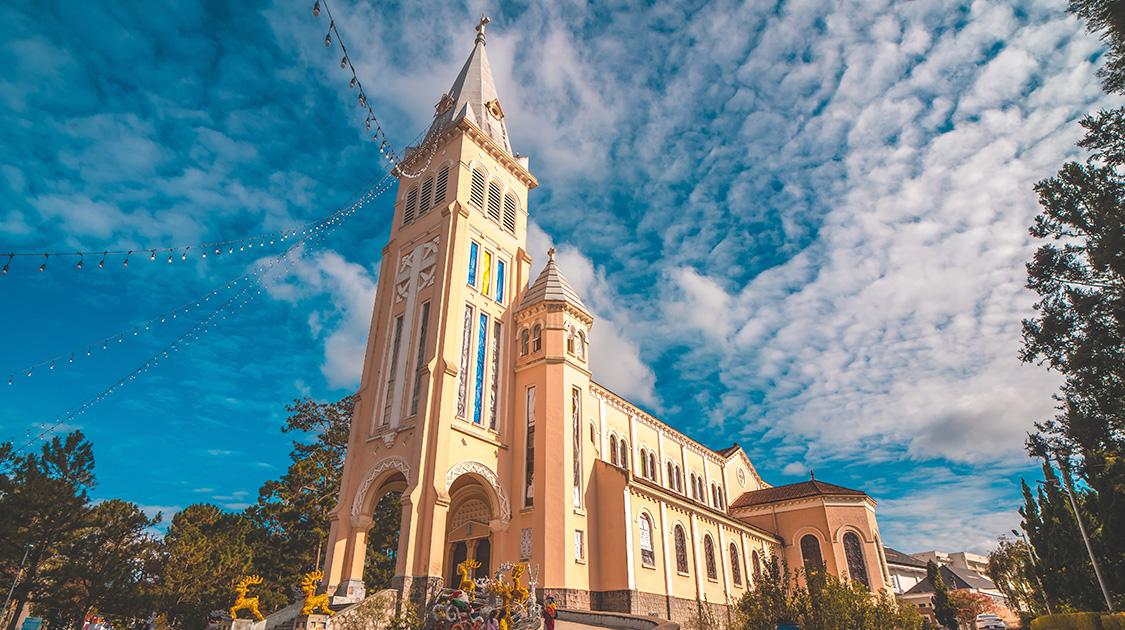 Nhà thờ Con Gà là biểu tượng kiến trúc nổi bật của thành phố Đà Lạt. Công trình mang phong cách châu Âu với tháp chuông cao, cửa kính màu và không gian sân rộng phía trước.